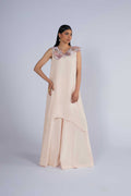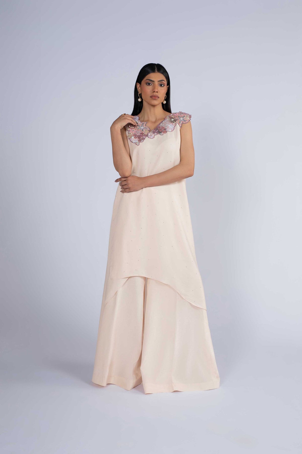 Crafted from premium crepe, this modern two-piece features an edgy asymmetrical cut with delicate neckline embroidery enhanced by shimmering French sequins. Paired with matching crepe trousers.