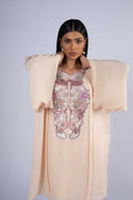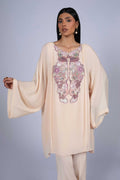 Crafted from pure crepe tisheen in an elegant powder pink, this refined two-piece showcases delicate hand embroidery adorned with luminous French sequins and intricate resham detailing. Paired with modern raw silk bootleg trousers.