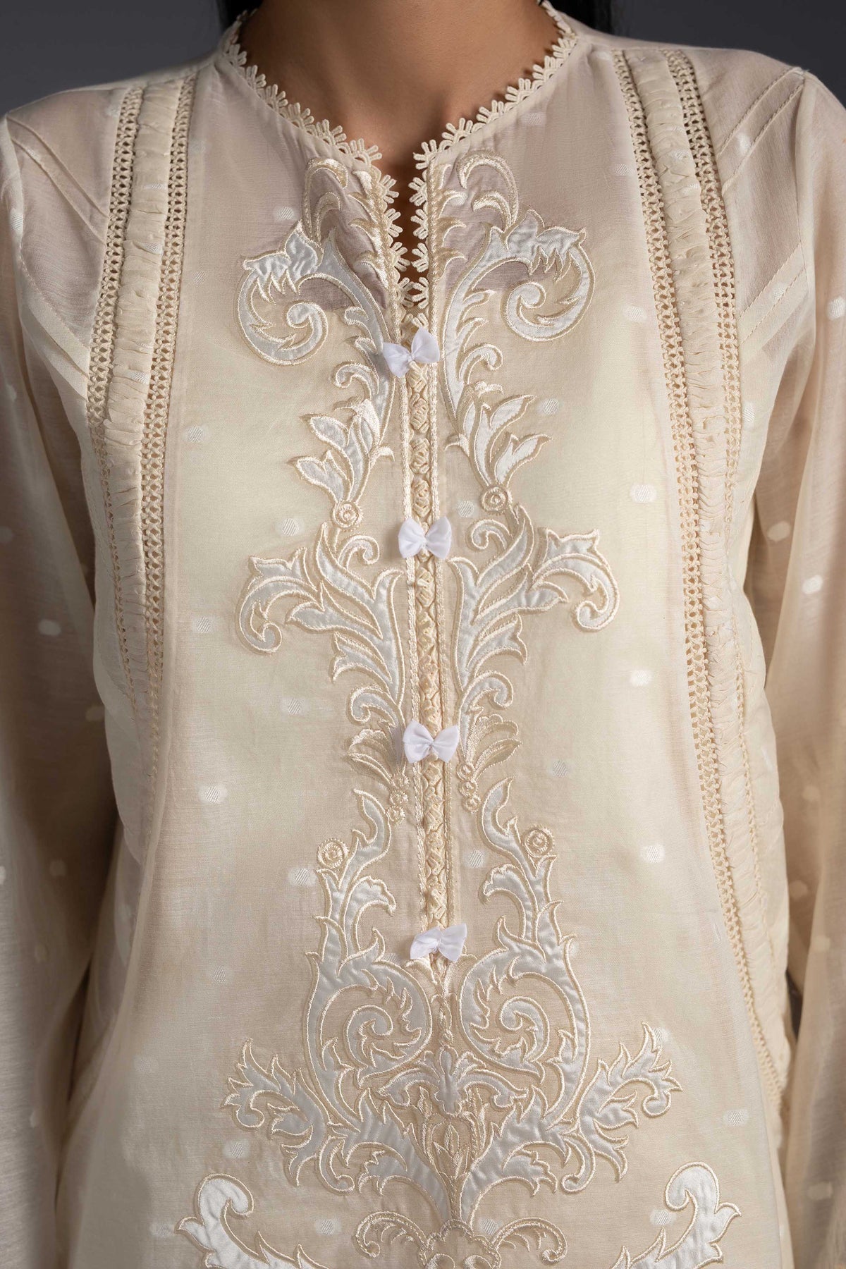 This elegant Shirt is crafted from sheer cotton organdi with charmeuse appliqué, featuring artisanal detailing on the neckline and shoulders. it offers a graceful silhouette blending traditional charm with a modern, airy feel.