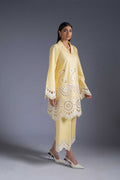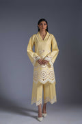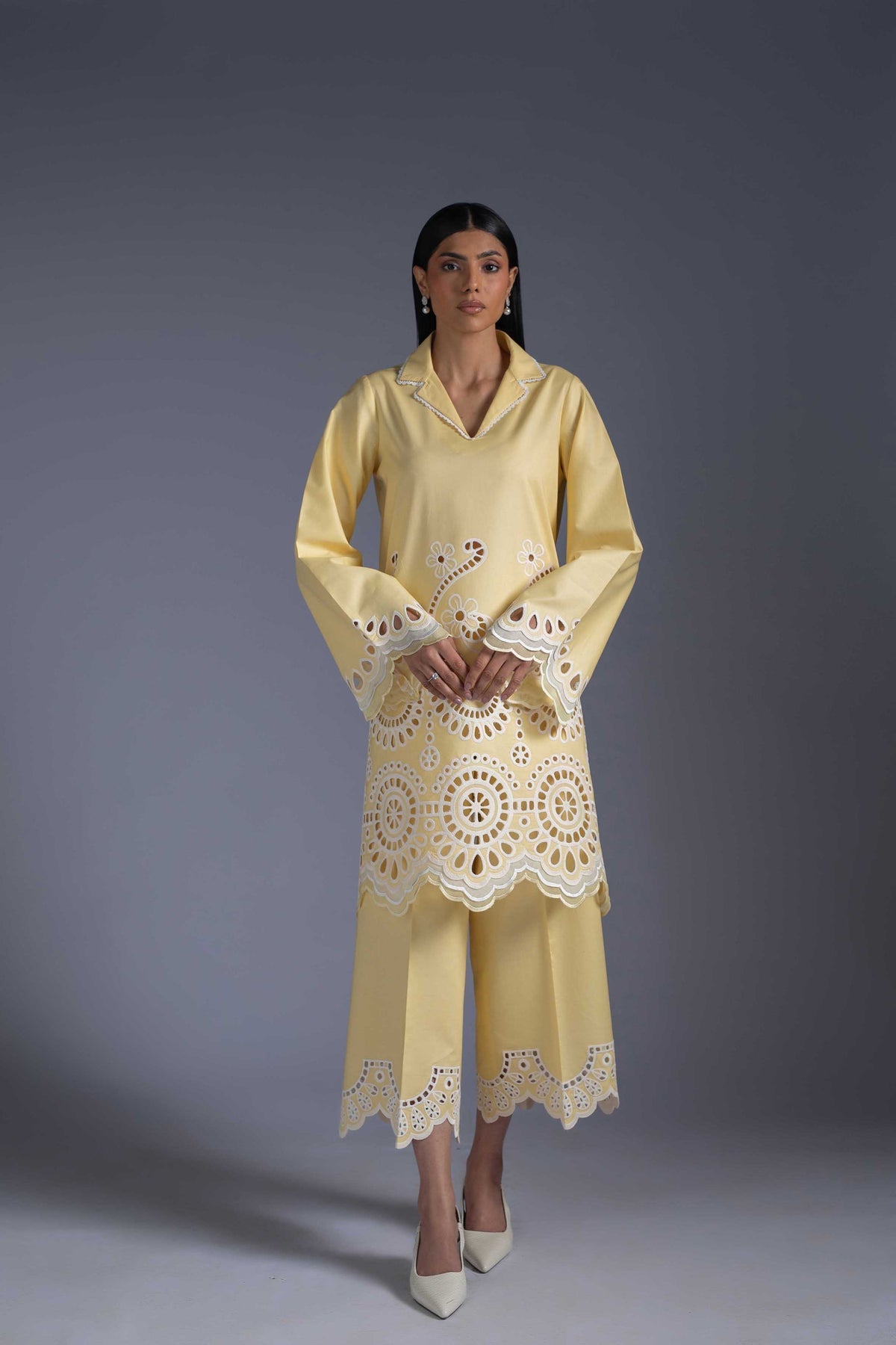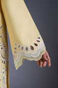 Crafted from premium yellow pima cotton, this vibrant two-piece offers luxurious comfort with a refined feel. Intricate schiffli embroidery on the shirt and matching pants adds a delicate, airy charm.