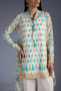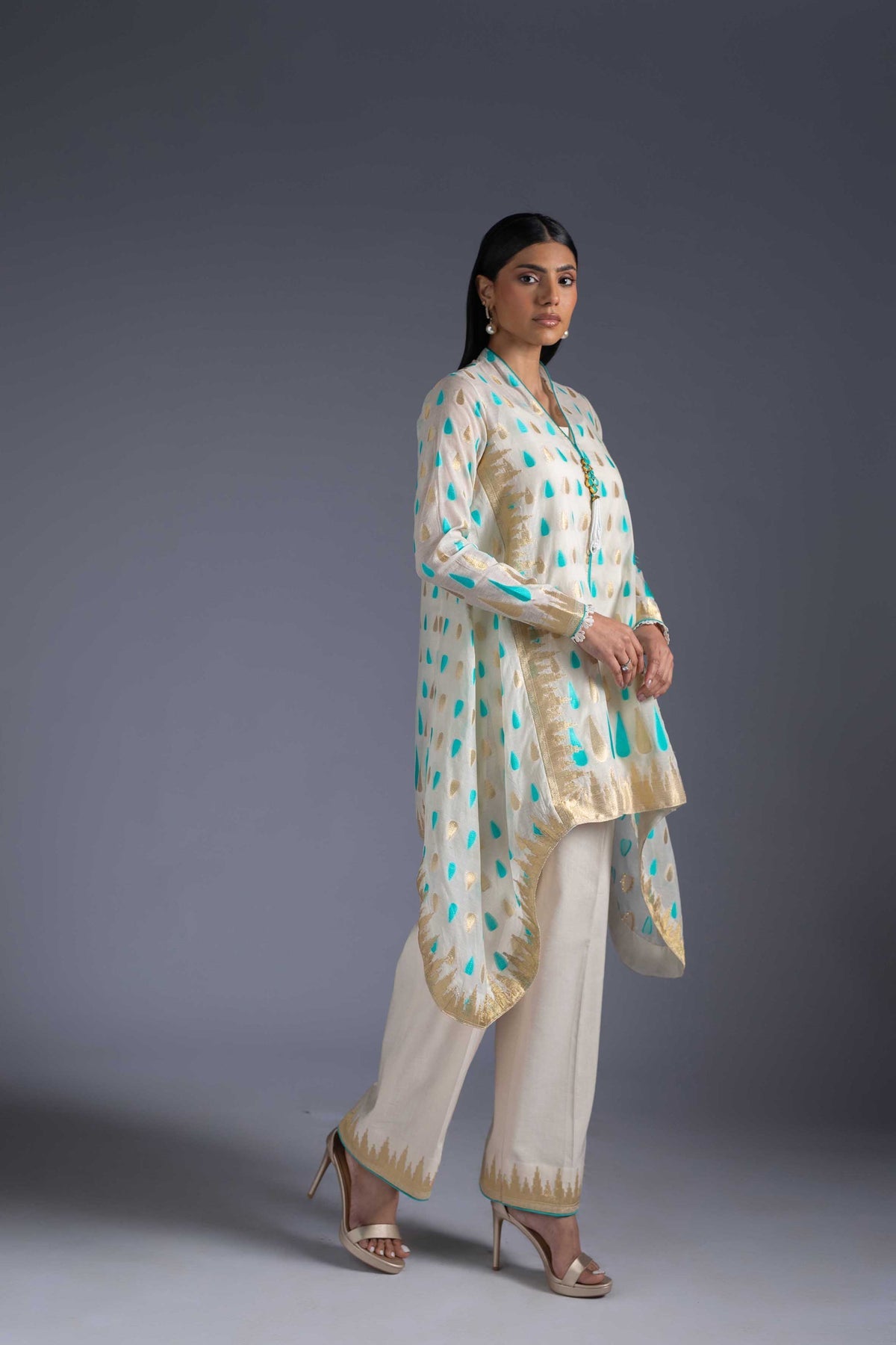 This luxurious three-piece features a modern asymmetrical shirt in pure Banarasi fabric, accented with traditional zari borders.