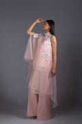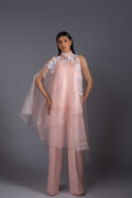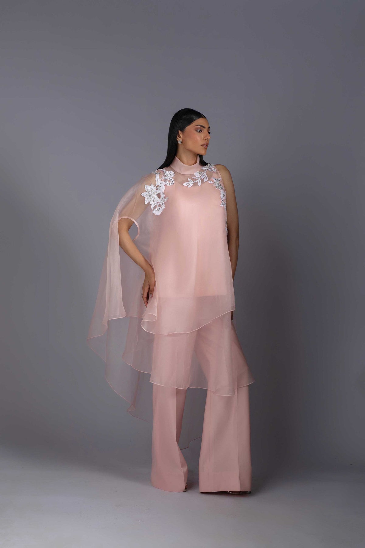Crafted from pure organza, this three-piece outfit features a sleek modern cut for a chic look.