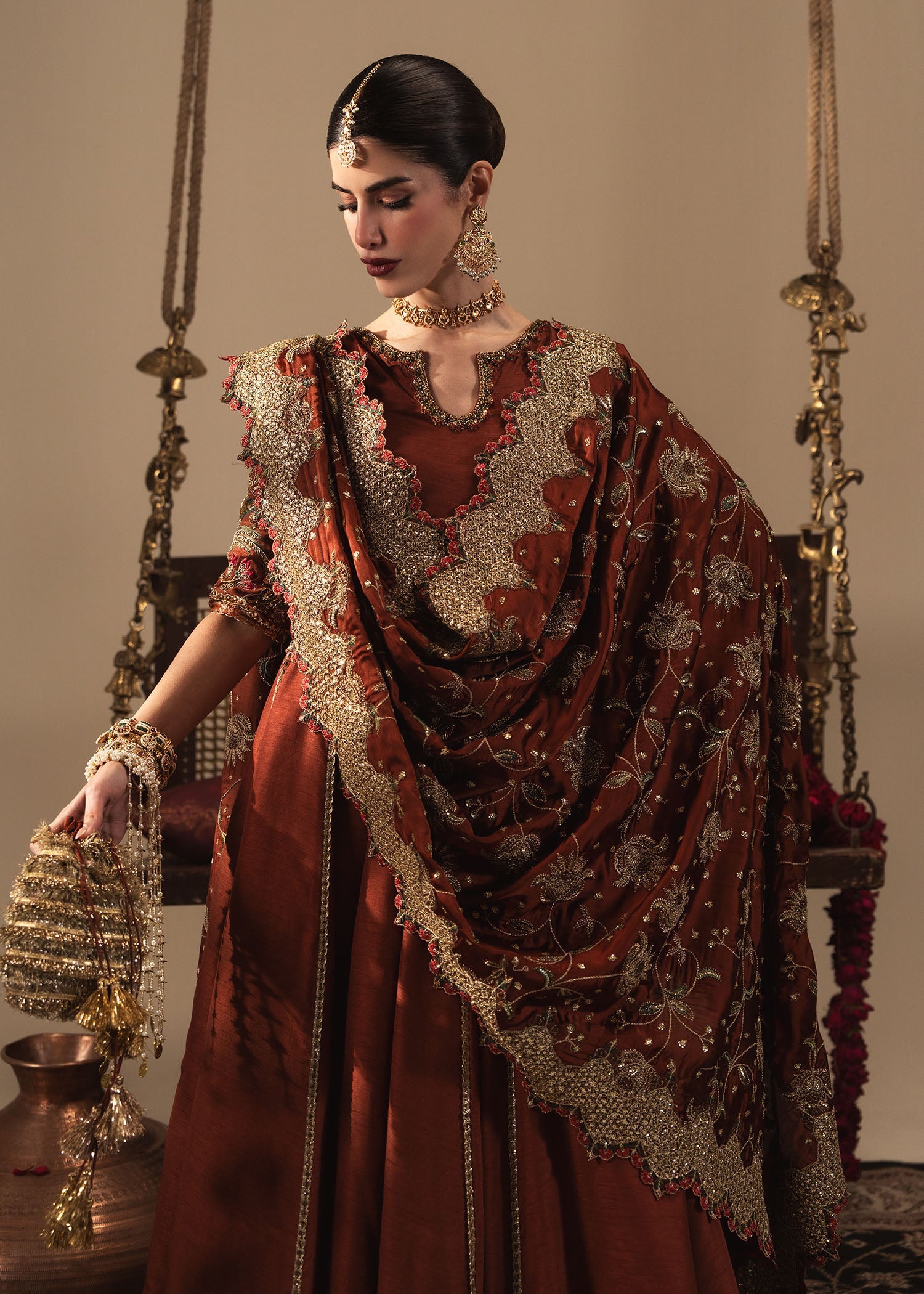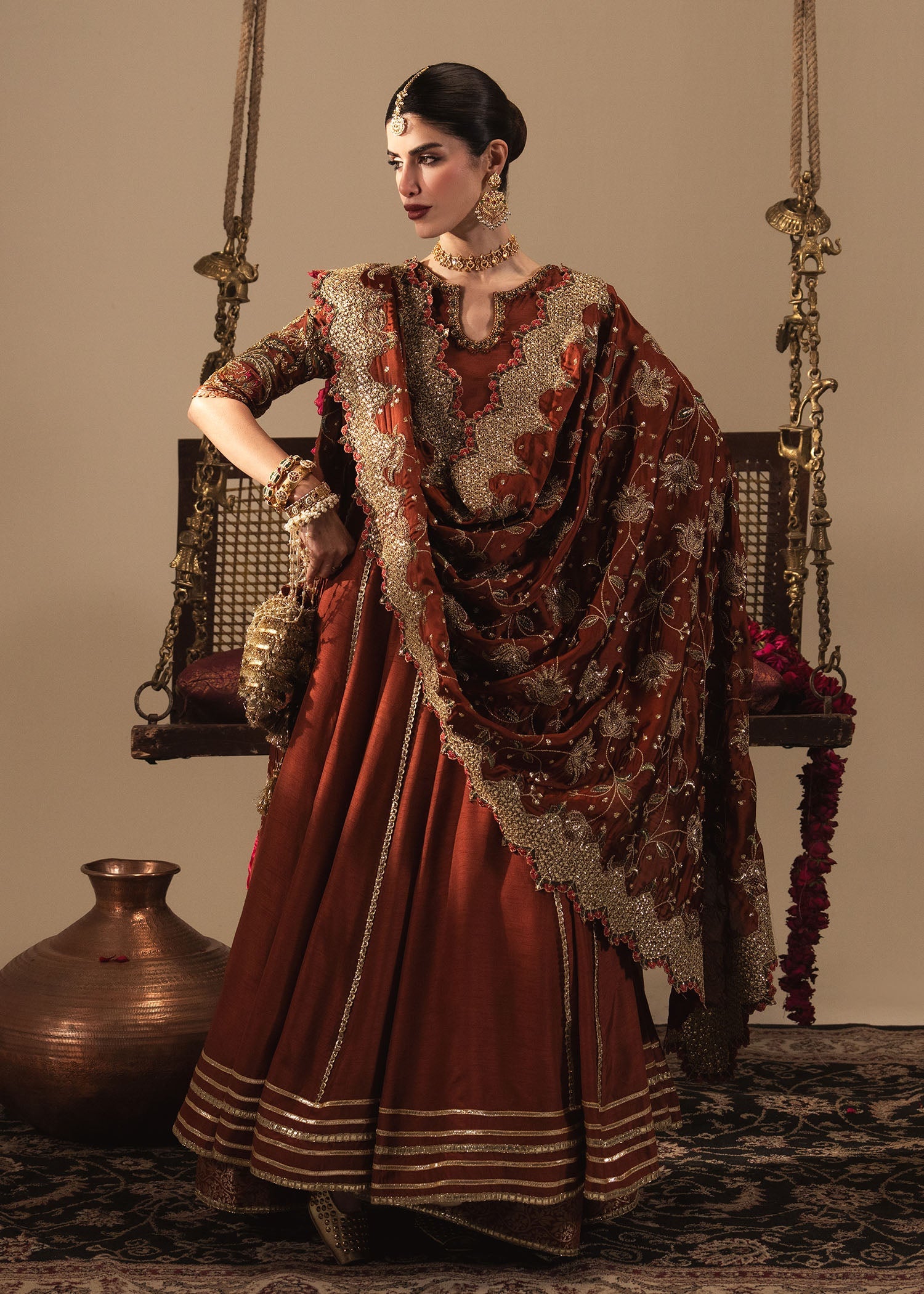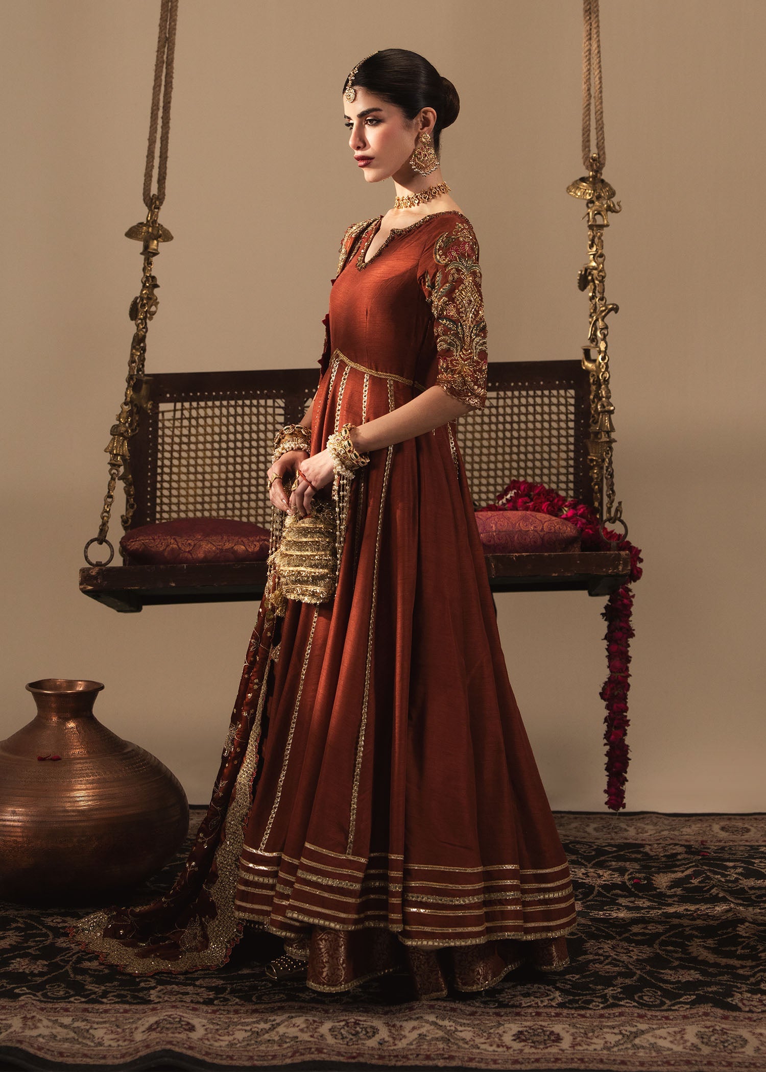 Kalidar Rust silk peshwas with gota detailing and multi color hand worked sleeves crafted by hand.