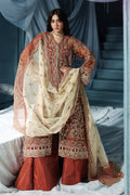 Igniting the season in imperial radiance, Burnt Topaz emerges in a mesmerizing burnt orange hue, evoking the fiery brilliance of its namesake gem. Its organza shirt is adorned with glistening embellishments, artisan embroidery, and intricate threadwork from front to back. Paired with raw silk trousers and a contrasting embroidered dupatta with a luxuriously embellished pallu. A celebration of regal warmth for the woman who enters every room like golden dusk.