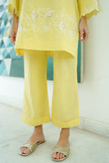 The Yellow Co-Ord Set Features A Floral Embroidery On The Front And Sleeves, Paired With Straight Trousers.