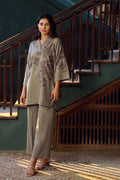 Mystic Ash is a dark grey co-ord set featuring a neckline with pintex details and floral embroidery on the front, paired with matching culottes.