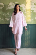 This light pink co-ord set features pintex details on the shirt, with floral embroidery and organza lining on sleeves, paired with straight trousers.