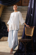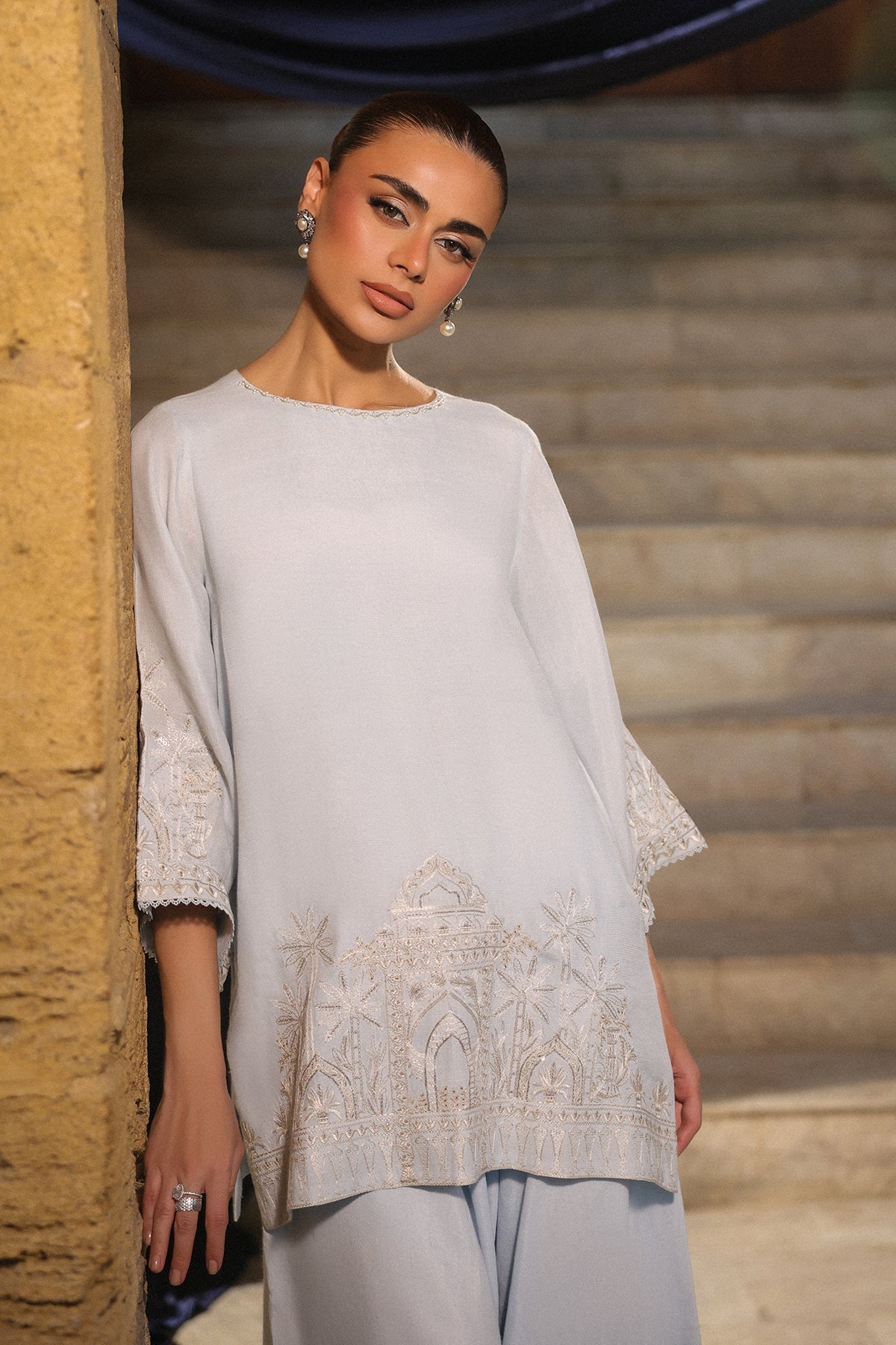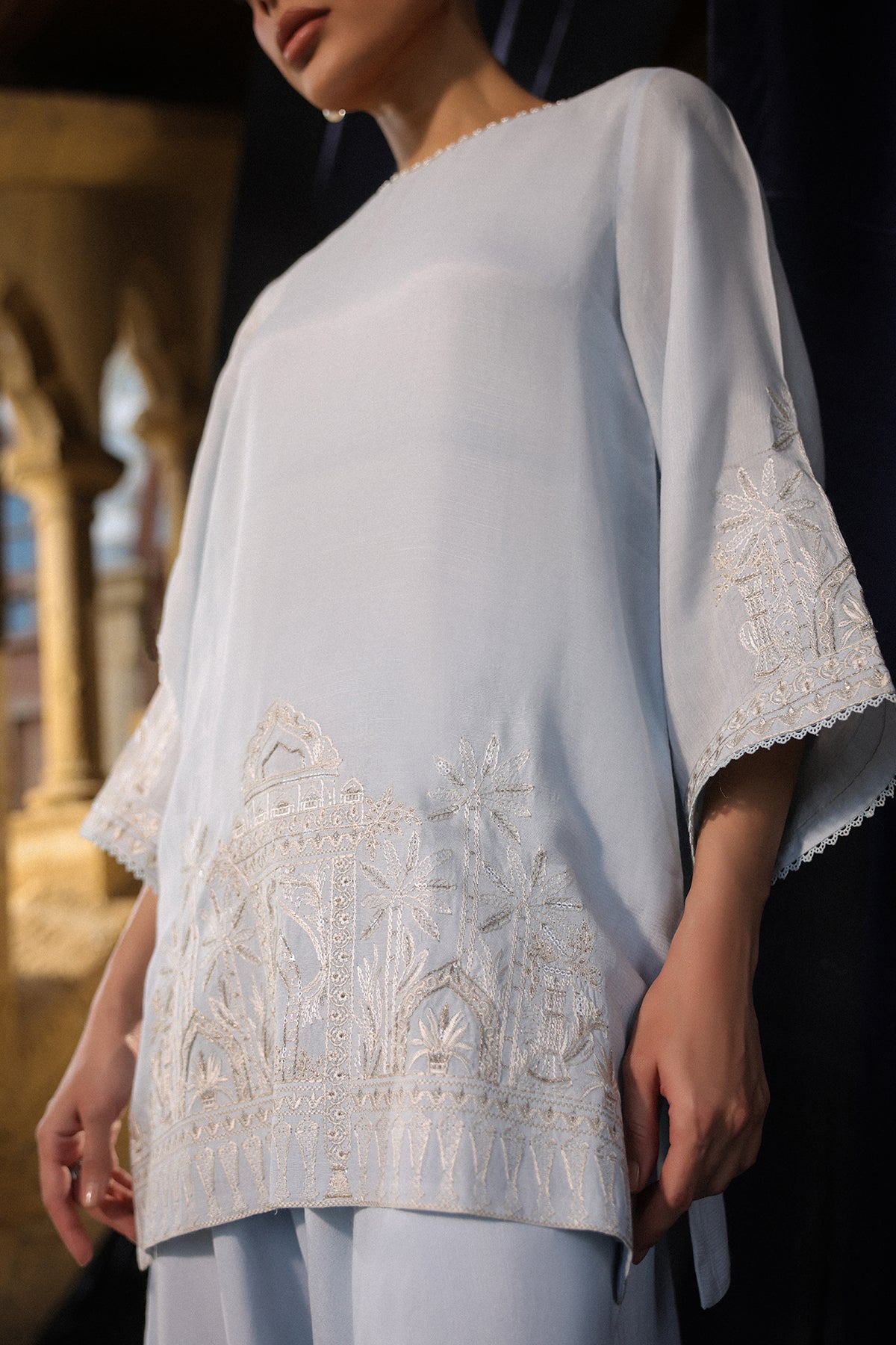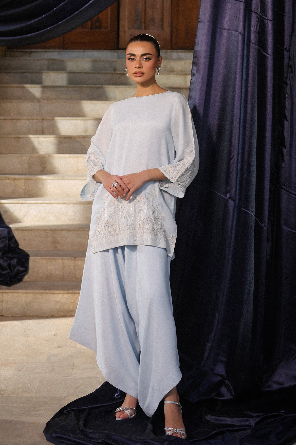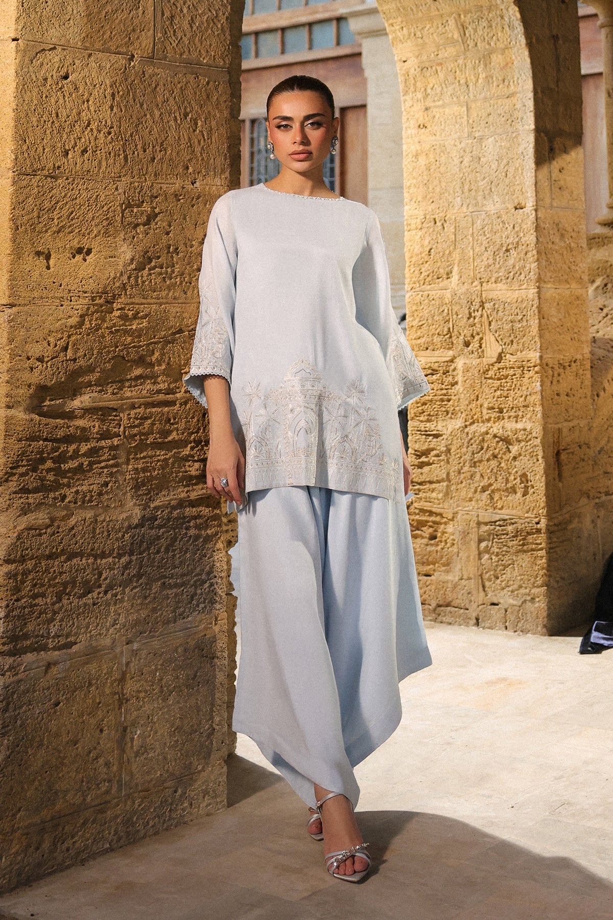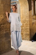 Subtle and serene, this powder blue set offers understated elegance. The embroidered hemline and clean cut lend a soft, modern charm. Perfect for graceful daytime wear.