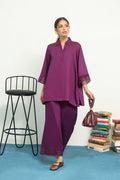 This sophisticated two-piece co-ord set is presented in a rich, solid plum color. The ensemble features a relaxed, tunic-style top with a V-neck and a structured collar, paired with matching loose straight-fit trousers. The defining and most striking feature of the outfit is the meticulous thick lace border on tunic’s three-quarter sleeves, and trousers hem. Overall look is effortlessly polished and modern.