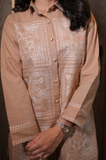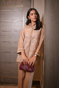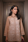 A sophisticated beige co-ord set featuring intricate white embroidery inspired by geometric patterns. The shirt showcases a straight-cut silhouette with a band collar and delicate lace detailing on the sleeves and hem, exuding refined minimalism. Paired with matching straight trousers.