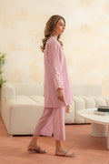 A soft pink ensemble featuring delicate laser-cut embroidery on organza at the back yoke and sleeves. Ideal for intimate gatherings or refined daytime events, paired with straight pants for an effortlessly graceful look.