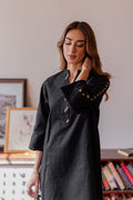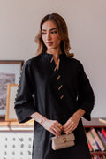 A sleek black co-ord set exuding refined minimalism. The shirt features a V-slit neckline with metallic accents and ladder lace detailing on the sleeves, paired with straight trousers adorned with cutwork lace hems for a touch of understated sophistication.