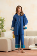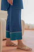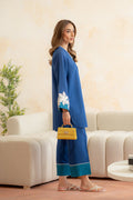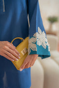 A bold blue co-ord set featuring bright teal color blocking on the sleeves and pants, elevated with white 3D floral borders on the sleeves for a fresh, standout look.