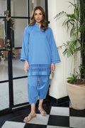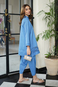 This Elegant Blue Dobby Kurta Features A Sleek Band Collar, Straight Silhouette, And Intricate Hem Detailing. Paired With A Relaxed-Fit Matching Shalwar.