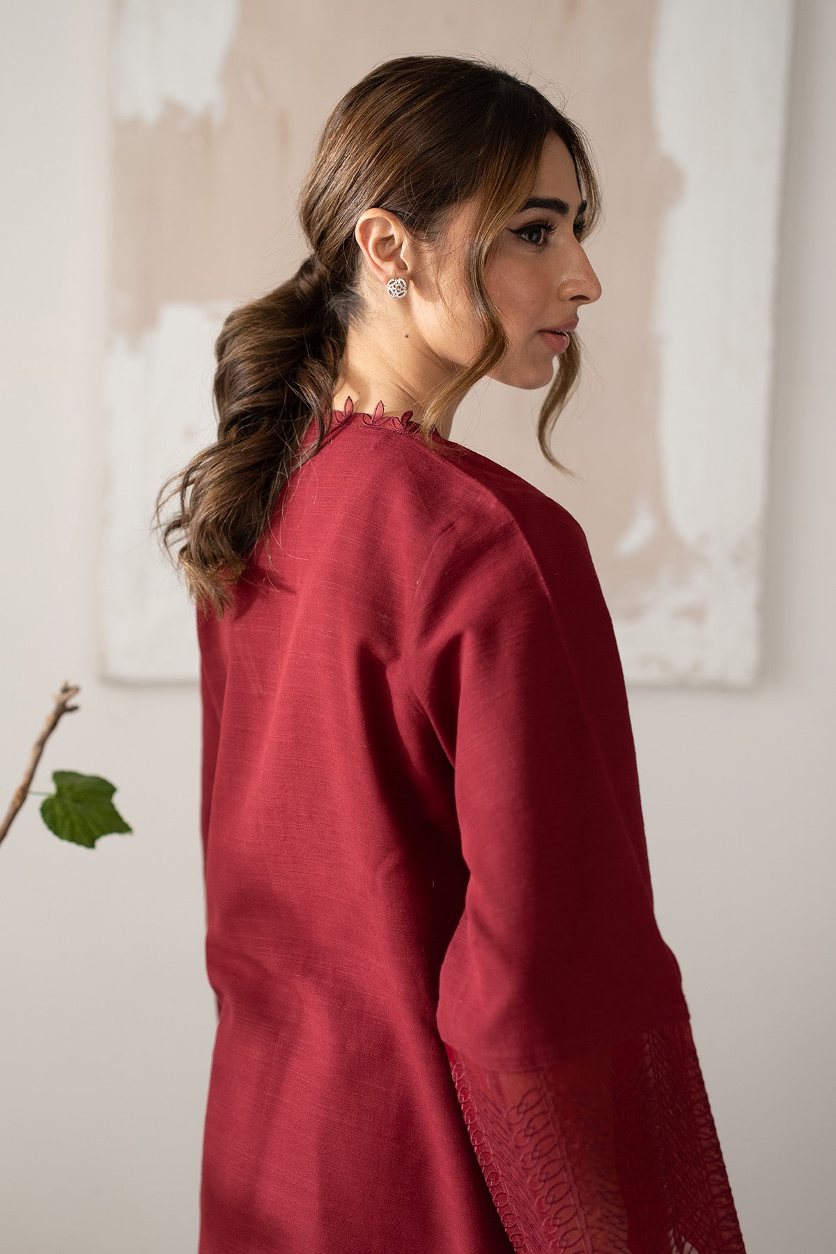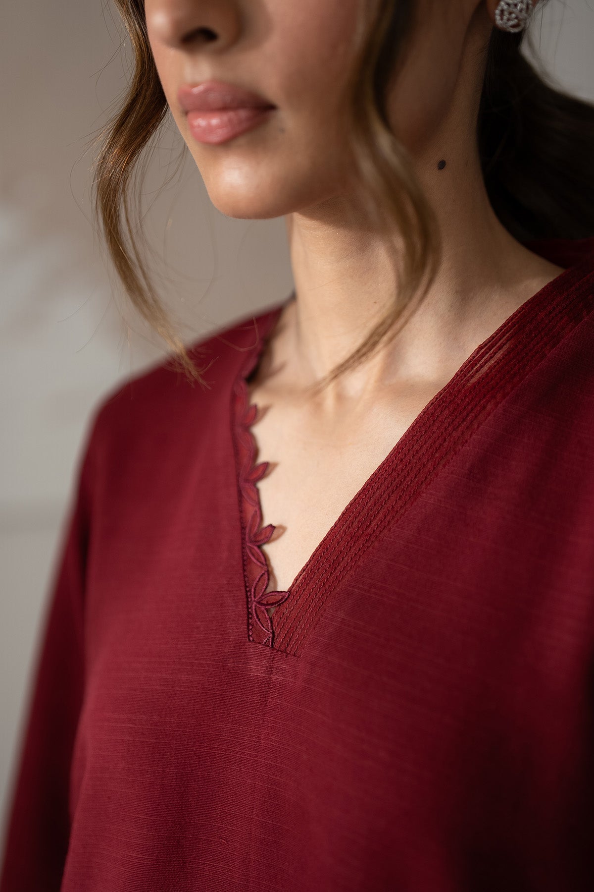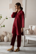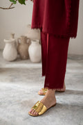 The Crimson Red Co-Ord Set Features A V-Shaped Collar, Embroidered Floral Sleeves Borders And Embellished With Lace. Paired With Matching Trousers.