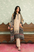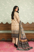 Rendered in earthy beige, this 3-piece suit is infused with timeless elegance. The shirt features detailed black ornamental motifs and borders with hints of rust and maroon, lending a rich ethnic charm. Paired with soft beige trousers for subtlety, the look is elevated with a multi-toned dupatta carrying intricate ethnic and geometric designs.
