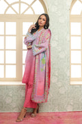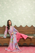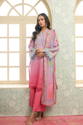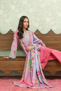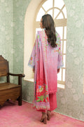 A refreshing 3-piece suit in soft light blue to pink ombre base, elevated with delicate floral and geometric patterns in pastel greens and blues. The shirt features a straight silhouette with detailed borders along the sleeves and hemline, creating a graceful finish. Paired with solid pink trousers for a cohesive look, the ensemble is completed with a beautifully printed dupatta showcasing floral vines framed borders.