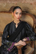 A striking black ensemble featuring intricate grey motifs and architectural-inspired patterns. Accented with hints of purple and olive on the borders and sleeves, this look is both bold and refined—perfect for evening elegance with a modern twist.