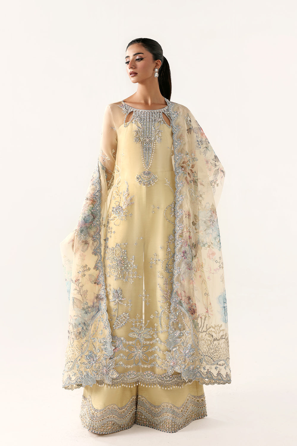 A delicate creation from Saira Rizwan, this butter yellow ensemble is a graceful play of texture and translucency. A butter yellow top and matching trousers, the look is layered with a long organza shirt adorned with intricate silver, white, and light blue embellishment and embroidery throughout. The printed organza dupatta adds a soft, ethereal finish, completing this three-piece stitched outfit with understated elegance and modern sophistication. Cut out detailing in the neckline.