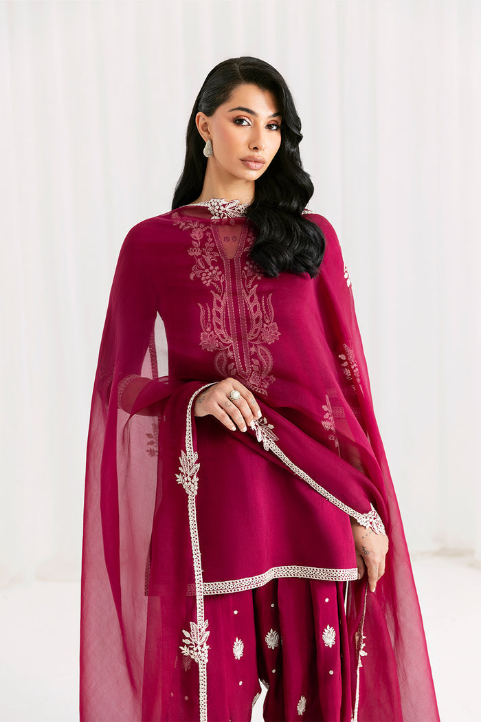 A graceful three-piece outfit featuring a Korean raw silk shirt with intricate Rashem thread embroidery and organza patch detailing. Paired with a pure embroidered organza dupatta and matching embroidered silk shalwar, this look blends elegance with timeless charm.