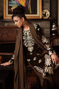Seamlessly refined and enduringly festive — this three-piece suit features a rich brown velvet shirt adorned with embroidery and classic ada work along the front, back, sleeves, neckline, and scalloped hem. It’s paired with azar silk pants detailed with a velvet border and a matching dupatta framed in velvet. Where layers of texture meet fluid motion — this ensemble doesn’t just enter the season, it owns it.
