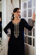 A winter essential from Saira Rizwan, this long kaftan-style navy blue outfit is a stunning blend of tila-resham and hand embellishment, beautifully accented with Mukesh and mirrorwork along the neckline, sleeves, shirt hem, and back. Paired with velvet straight pants, this two-piece stitched ensemble is the perfect expression of modern winter luxury.