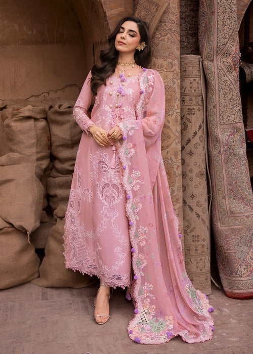 Ophelia, captivates in a luscious deep blush hue an arresting shade that commands attention and lingers in memory. The ensemble comes to life through exquisite floral laser work and delicate organza appliqué embroidery, where rich tones of blush pinks and soft ivory intertwine within graceful, swirling botanical patterns. The laser-cut appliqué neckline, adorned with leafy vine motifs, lends a refined femininity and intricate charm. A beautifully printed floral chiffon dupatta completes the look, framed with a pink scalloped border that drapes like a gentle whisper across the shoulders. Finished with elegant cutwork detailing on all four corners, it envelops the wearer in an aura of effortless sophistication and timeless grace.