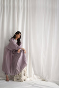 Lavender georgette, long attire detailed with pleats on hem, adorned with stunning hand worked details on the neckline. It can be paired with matching pants.