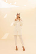 Ivory eyelet cotton shirt with a pleated neckline and gathered sleeves, embellished with buttons.