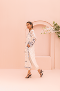 A pristine white self organza shirt with unique embroidery on front, scalloped hemline, sleeves and side pockets, adorned with beautiful tassels.