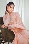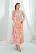 Peach, Kalidar peshwas on flowy, embroidered chiffon with floral, embellished neckline and sleeves. It can be paired with beautiful, printed chiffon dupatta and embellished straight pants.