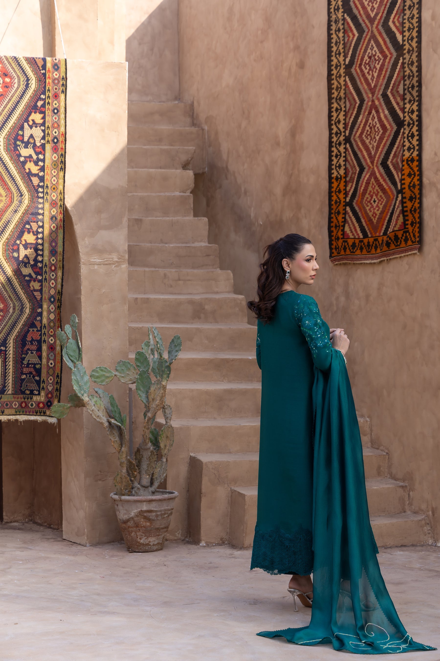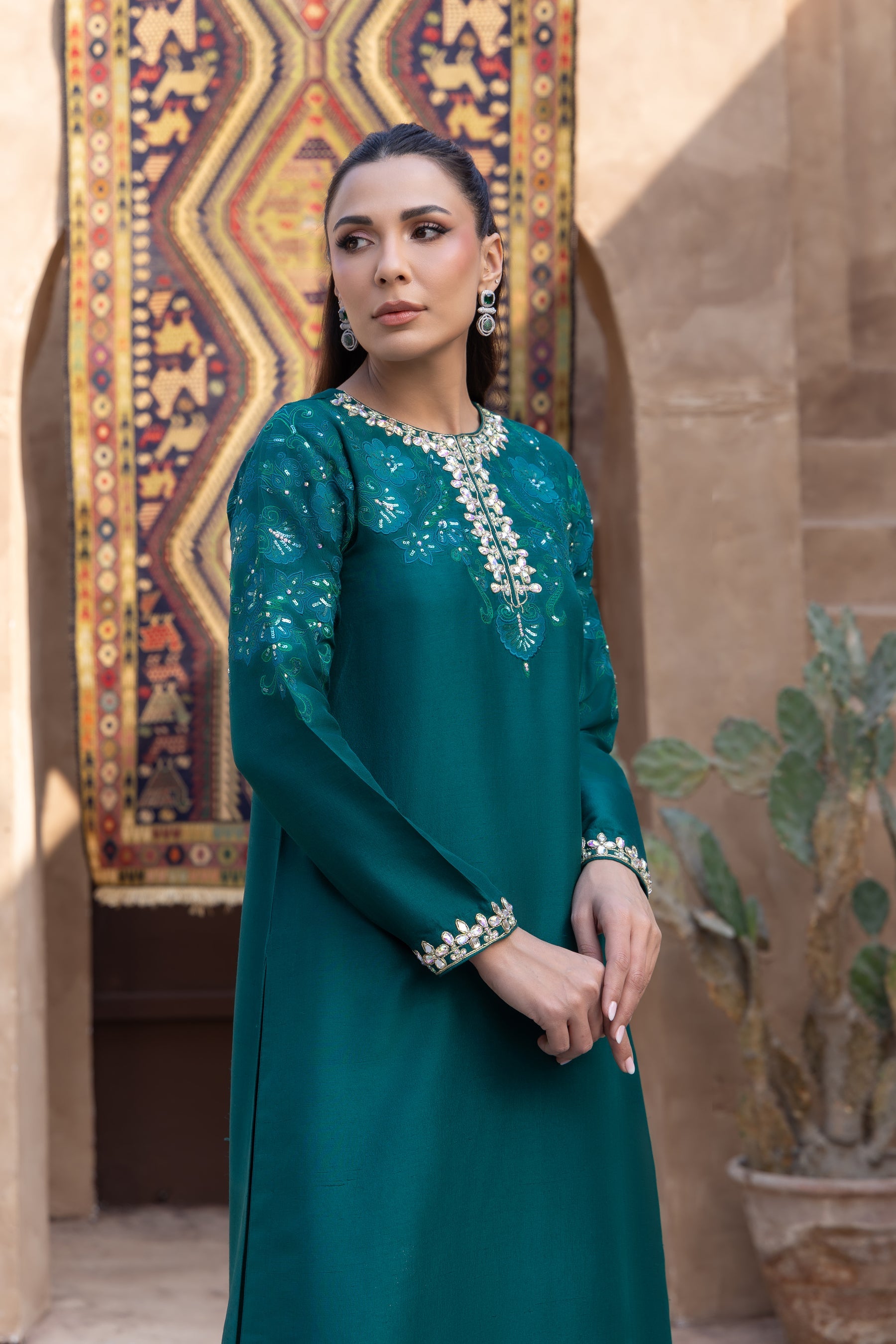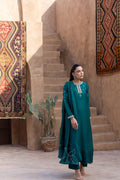 A royal shade of emerald green cut in to flowy silk, excluding a modern embroidery pattern on the neckline and sleeves, enhanced with a dazzling neckline edged with a lacey hemline.