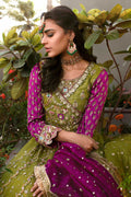 The sleeves and the border are covered in print giving the dress a tinge of pink, paired with a magenta detailed dupatta.