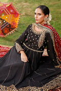 A dazzling black floor length kalidaar peshwas that has intricate hand work embroidery on the bodice and sleeves, featuring dabka and marori work in a timeless gold shade, and finished with a beautiful printed border. It is worn with a traditional maroon chunri dupatta to further elevate it's look.