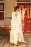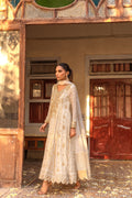 This sophisticated ivory silk net peshwas has resham, mirror and mukesh work. It’s paired with straight pants and embellised sheer net dupatta.
