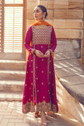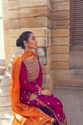 This deep, magenta raw silk shirt is elegant and perfect for these festive season. The shirt has two slits intricate floral motifs with zari and handcrafted embroidery. The bodice is embellished by resham and kora dabka. The sleeves are artfully embroidered with zari details and paired with embellished pants and dupatta.