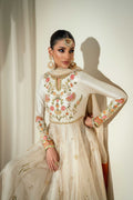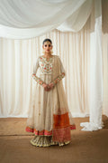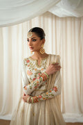 Radiating luxury in a soft ivory shade pishwas with a pure raw silk bodice and sleeves adorned with intricate floral resham embroidery and the flare cut on sheer zari net enhanced with gold Mukesh work, edged with a uniquely designed contrasting embellished border elevating its regal look.