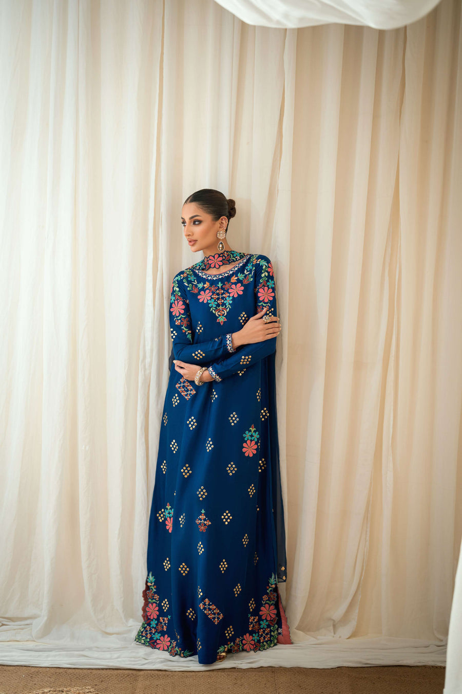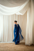 A gorgeous pure raw silk kaftaan in a shade of cobalt blue, embroidered with exquisite multi colored florals, further enhanced with gold Mukesh motifs scattered all over. To give it a more refined look it is paired with an stylish chiffon duppatta edged with gold detailing enhancing its timeless elegance.