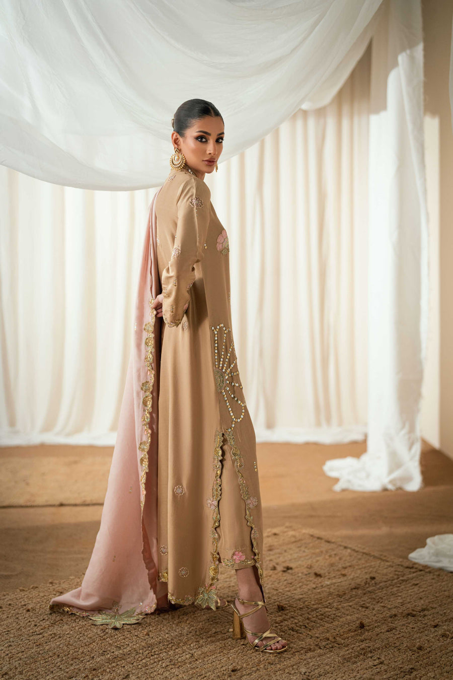 A royal shade of dull gold effortlessly cut in pure raw silk kaftaan, with appliquéd floral motifs, further beautified with gold silver Mukesh patterns on shirt, sleeves and neckline edged with hand embroidered borders on hemline.Completing the look, it is paired with embellished pants and a heavily embellished silk duppatta edged with pretty floral motifs.