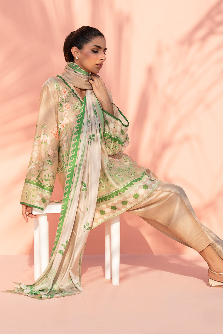 A softly tailored ensemble in warm champagne, lifted with fresh verdant accents and a delicate floral print. The relaxed khaddi silk shirt features a painterly botanical design, framed with geometric borders along the neckline, cuffs, and hem. Paired with matching pure rawsilk shalwar that balances ease and structure, the look is completed with a coordinating medium silk dupatta edged with bold green patterning and subtle motifs for an effortless blend of craft and modern polish.