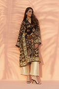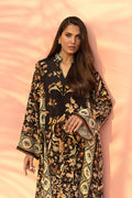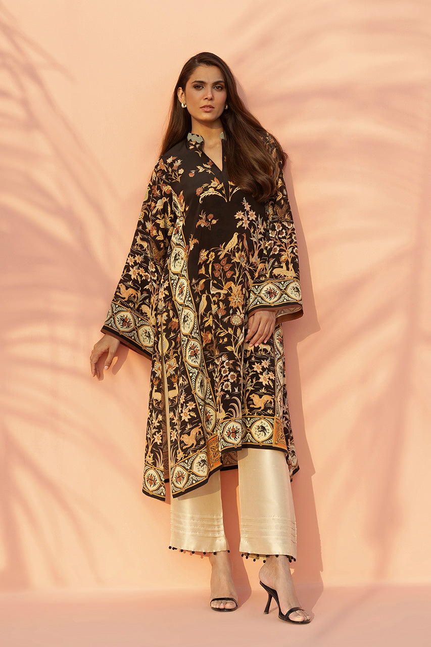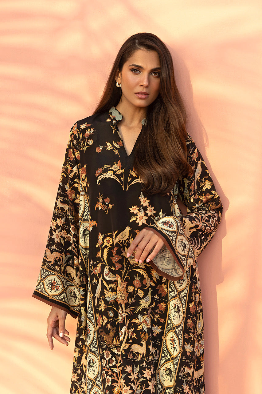 An earthy noir palette comes alive through intricate storytelling and ornamental detail. The ebony hued A line crepe shirt, finished with a band collar, is adorned with a tapestry of florals, foliage, and delicate wildlife motifs, arranged within borders that frame the silhouette. Wide sleeves and a softly flared form lend graceful ease. It is paired with pure rawsilk cream culottes, finished with fine pintuck accents and subtle edging, creating a contemporary expression.