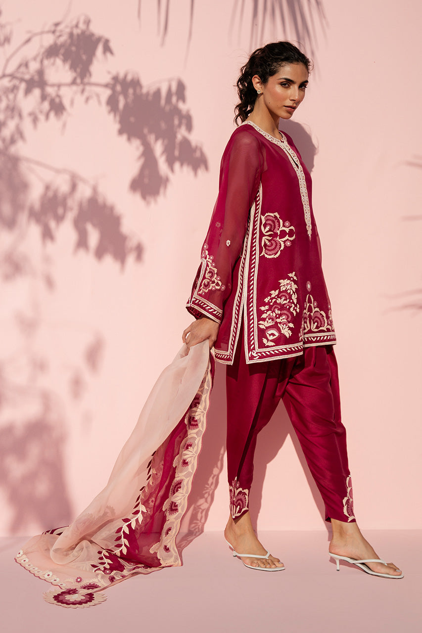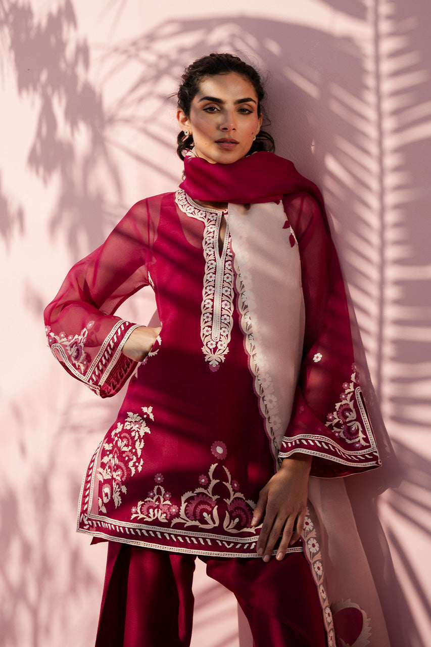 This crimson ensemble is defined by intricate aari embroidery tracing the neckline, sleeves, and hem with quiet precision. The sheer organza shirt is layered over a matching pure rawsilk shalwar and a crepe slip, creating a fluid, elongated silhouette. A softly draped organza dupatta, color blocked in crimson and cream and detailed with delicate aari embroidery, completes the look, offering a composed take on occasion dressing with an artisanal edge.
