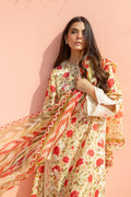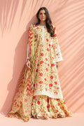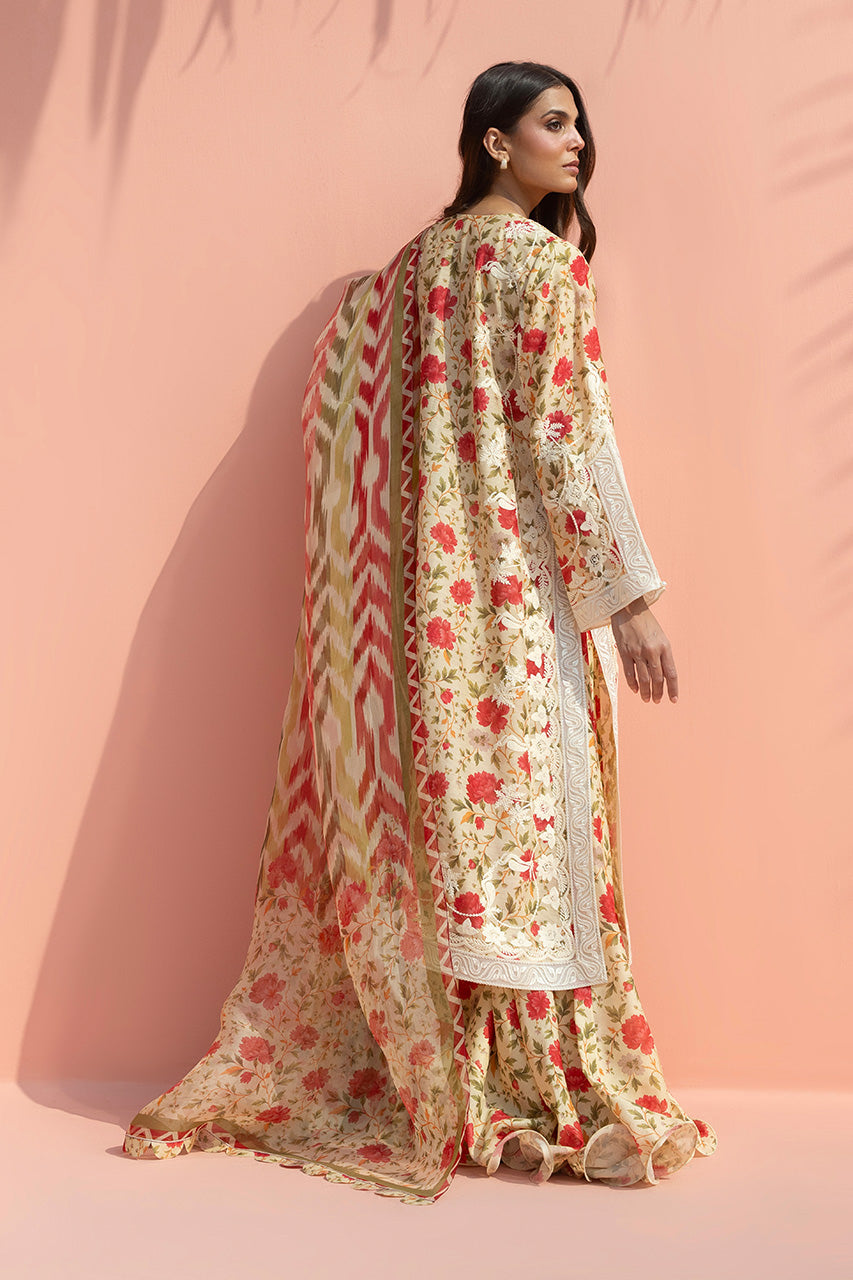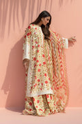 Soft cream tones meet warm scarlet florals in this romantic composition. The A line khaddi silk shirt features a delicate floral print, framed with aari embroidered borders along the neckline, sleeves, and hem. It is paired with a flowing ruffled khaddi silk lehnga that adds gentle volume to the silhouette. A contrasting organza dupatta, rendered in painterly stripes and florals, completes the look with an air of timeless femininity.