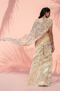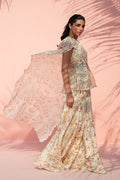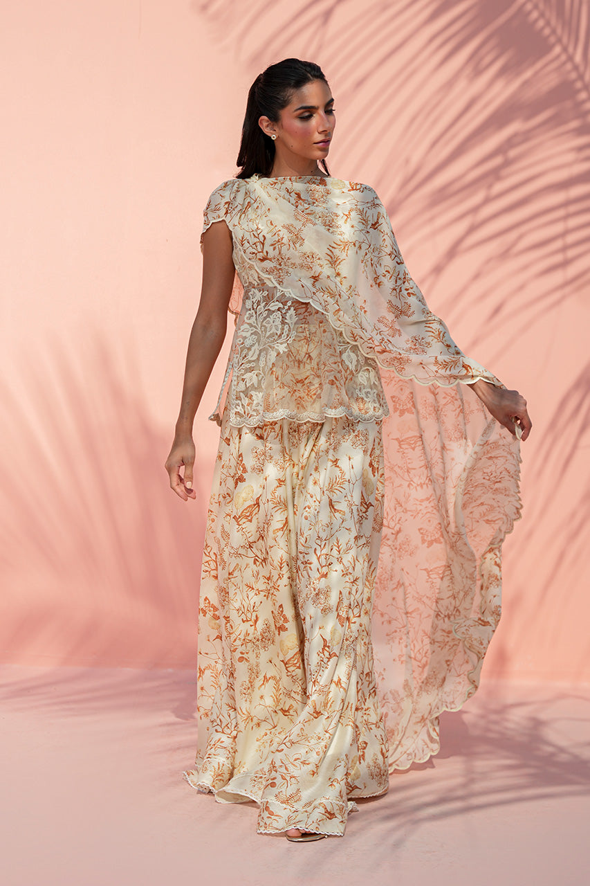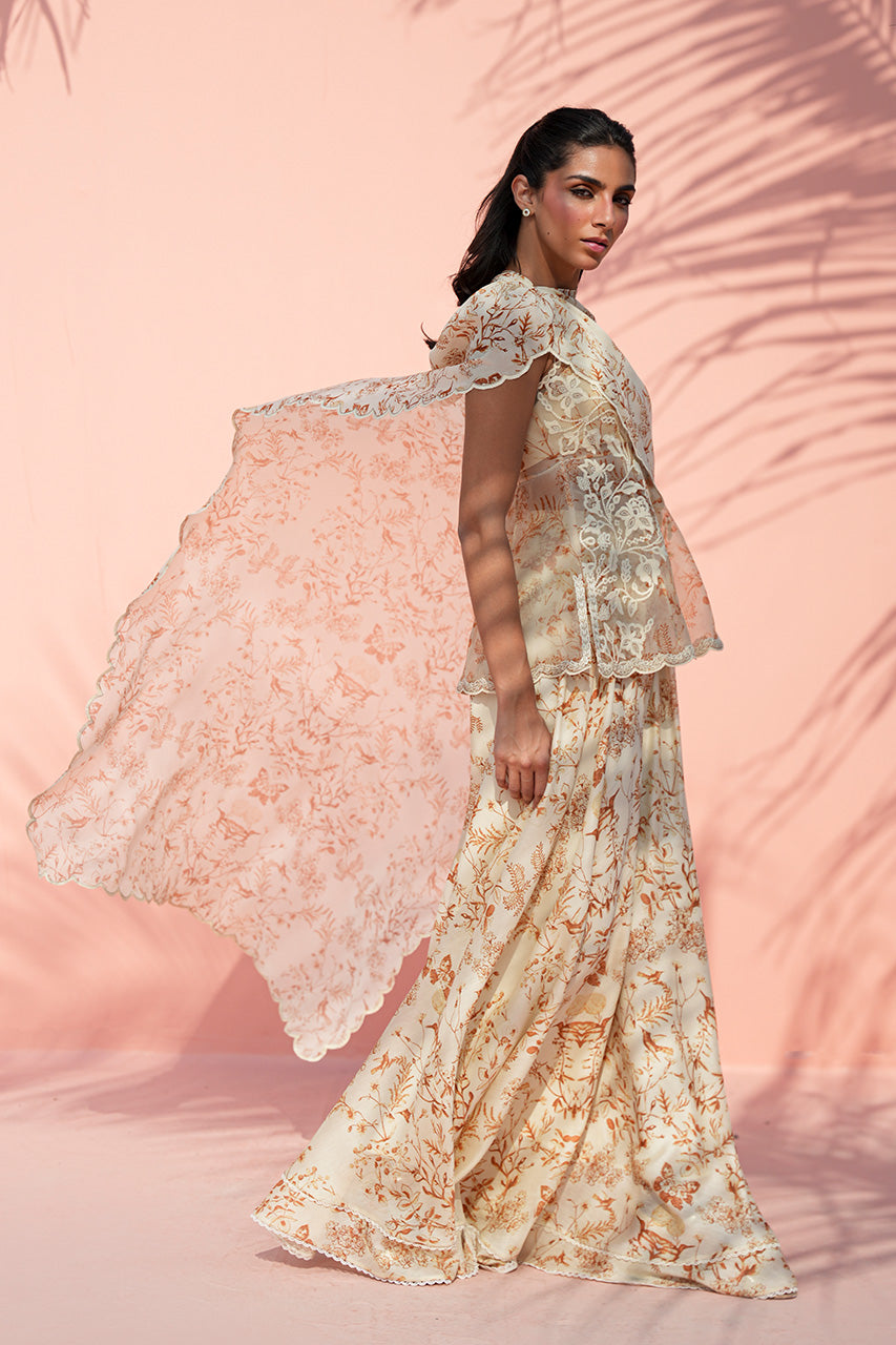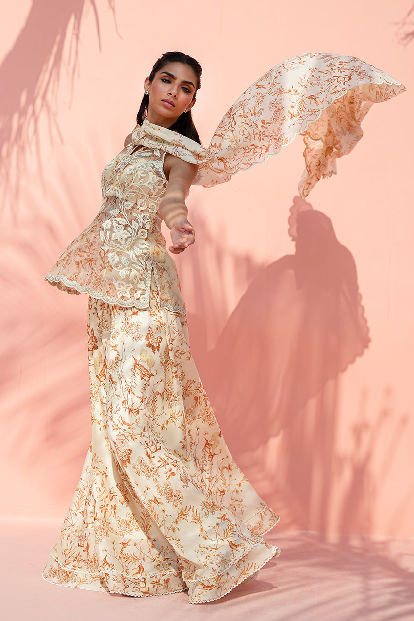 This fluid ensemble is rendered in soft cream, brought to life with delicate botanical prints in warm ochre tones. The organza peplum silhouette is paired with a georgette pre draped dupatta finished with scalloped edges, adding movement and dimension to the bodice. Flowing khaddi silk dhaka pajama mirror the print, lending continuity and ease. Light, romantic, and effortless, the ensemble makes a soft, elegant statement.