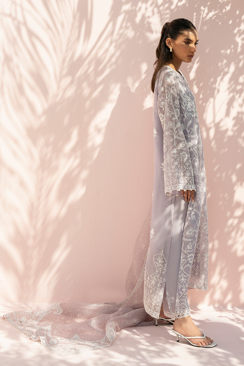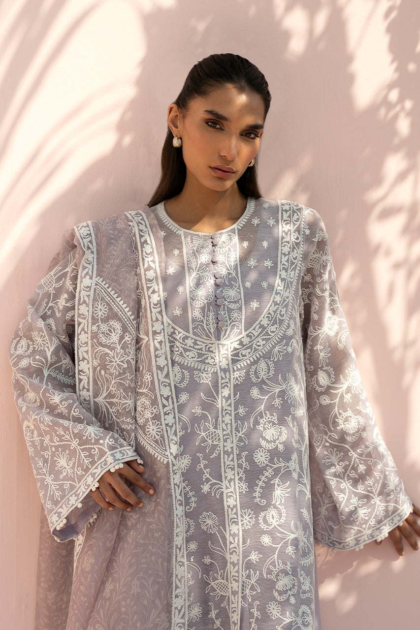 A softly fluid, long khaddi corduroy kurta in a muted lilac grey hue, adorned with delicate ivory aari embroidery. Intricate botanical and vine motifs unfold in a balanced all over composition, framed by refined borders along the neckline, front opening, sleeves, and hem. The look is paired with matching pure rawsilk culottes finished with embroidered hems, while a printed sheer embroidered dupatta drapes effortlessly, its trailing length adding lightness and movement.