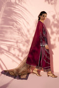 Rendered in a deep plum tone, this A line khaddi corduroy shirt is delicately embroidered with intricate threadwork and eyelet detailing, unfolding in ornate panels across the front. Fine scalloped borders along the sleeves introduce soft texture, while button accents at the neckline create a subtle focal point. The look is grounded by matching pure rawsilk culottes, finished with a contrasting printed hem and eyelet detailing for gentle contrast. An earthy toned organza dupatta, composed with a botanical print and framed with embroidered plum borders and eyelet accents, lends a whisper of vintage romance.