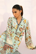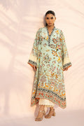 A fluid ensemble crafted in lightweight printed crepe, set on a fresh mint base and brought to life with an intricate tapestry of botanical, floral, and fauna inspired motifs. Delicate birds and foliage unfold across the surface, anchored by richly patterned borders framing the neckline, flared sleeves, and hem for a crisp, defined finish. Paired with cream pure rawsilk culottes, the look feels fresh, polished, and effortlessly elegant.