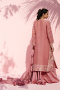 Evoking modern romance, this dusty rose ensemble unfolds in fluid layers. A sheer khaddi corduroy shirt is adorned with delicate floral embroidery drifting across the surface in painterly trails. Ornamental kantha embroidered borders in warm peach and muted sage frame the hem and cuffs. A softly draped khaddi silk dhaka pajama introduces graceful movement, while a ruffled georgette dupatta falls effortlessly, completing the look with poetic ease.