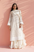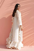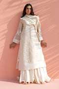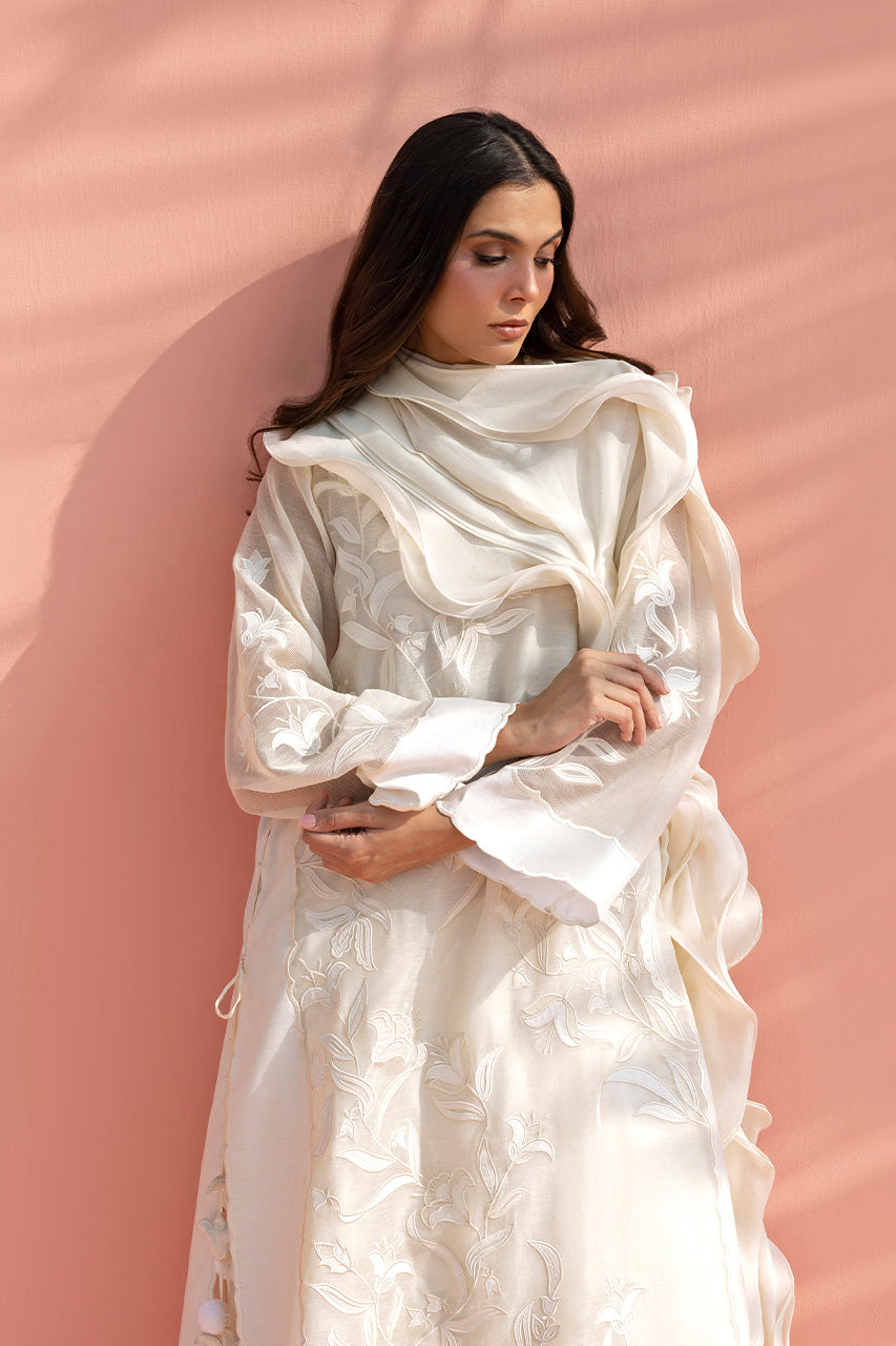 Evoking modern romance, this ivory ensemble unfolds in fluid layers. A sheer khaddi corduroy shirt is adorned with tonal floral appliqué embroidery drifting across the surface in delicate, painterly trails. Scalloped embroidered borders frame the hem and cuffs. A softly draped khaddi silk dhaka pajama introduces graceful movement, while a ruffled georgette dupatta falls effortlessly, completing the look with poetic ease.