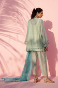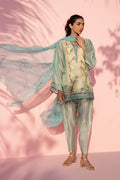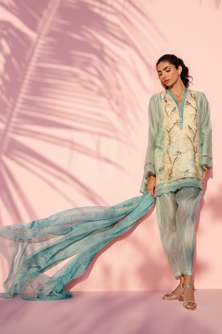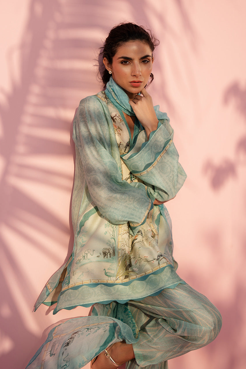 Soft powder blue and cream tones define this airy ensemble, anchored by a delicately printed cotton net shirt featuring chinyoueserie print and a refined V neckline. Sheer sleeves add lightness, finished with subtle border detailing for gentle definition. The look is paired with matching printed pure rawsilk shalwar, introducing contrast through linear patterning. A flowing chiffon dupatta, washed in pastel hues and edged with fine detailing, completes the ensemble.